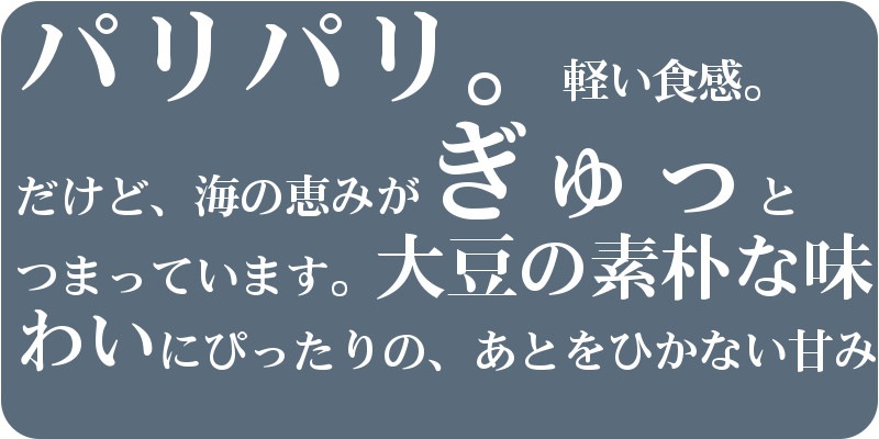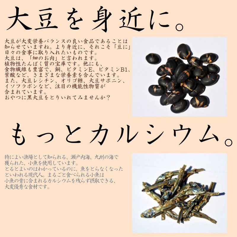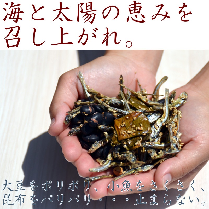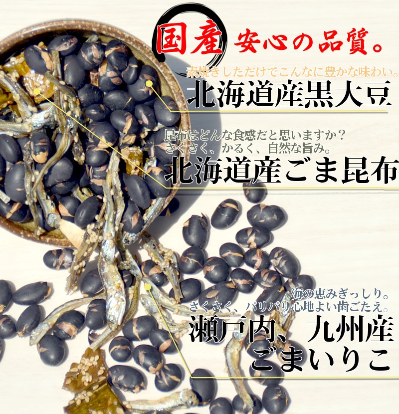 | 原材料名 | 黒大豆(北海道産)、煮干し(いわし(国産)、食塩)、砂糖、ごま、昆布(北海道産)、澱粉分解物、しょうゆ、食塩/トレハロース、調味料(アミノ酸等)、(一部に小麦・大豆・ごまを含む) ※片口イワシは、時期により九州産・瀬戸内産のいずれかのため、商品の表示には「国内産」と書かせて頂いております。 ※本品製造工場では、エビ・カニ・乳成分・小麦を含む製品を製造しています。 |
