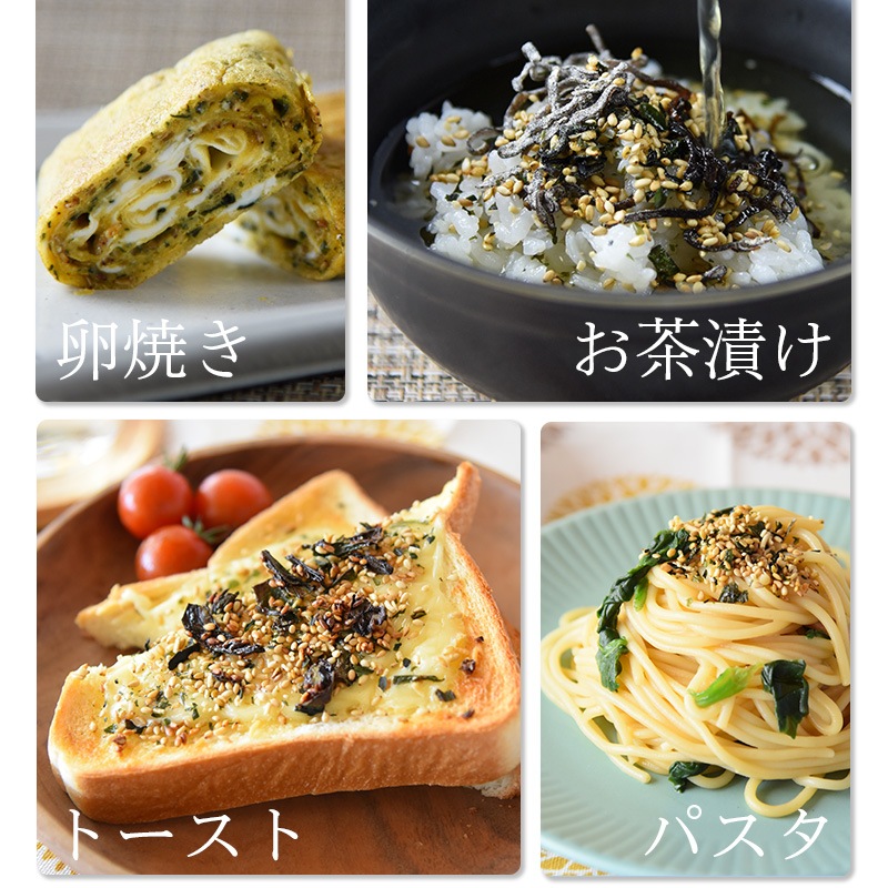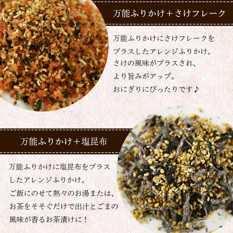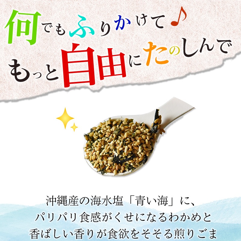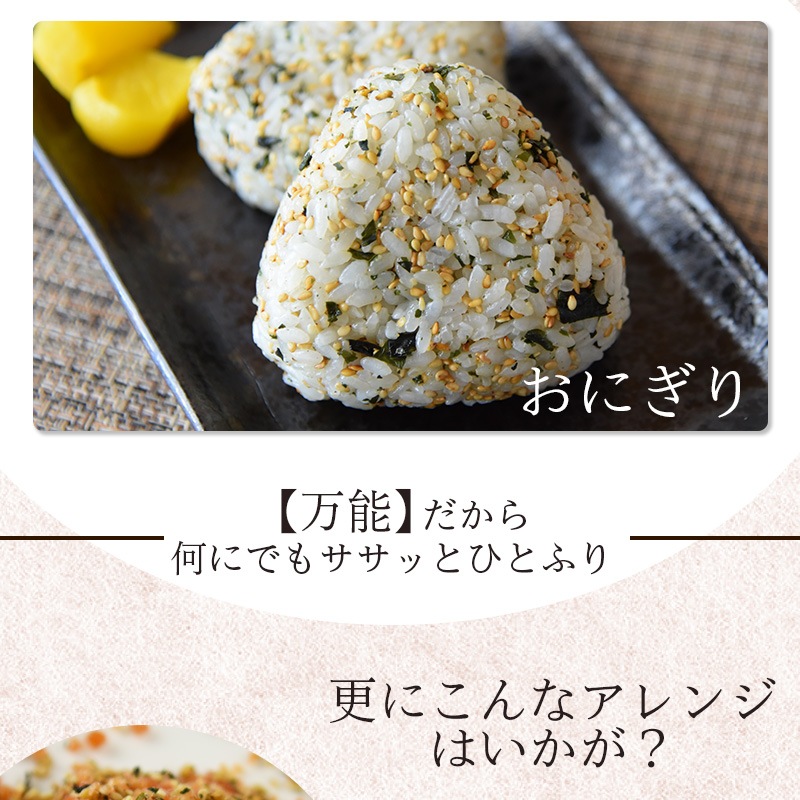 | 原材料名 | 煎りごま(国内製造)、わかめ、塩顆粒(食塩、酵母エキス)、砂糖、乳糖、還元水飴、みりん、食塩、魚介エキスパウダー/調味料(アミノ酸等)、香辛料抽出物、(一部に乳成分・ごまを含む) ※本品製造工場では、エビ・カニ・乳成分・小麦を含む製品を製造しています。 |