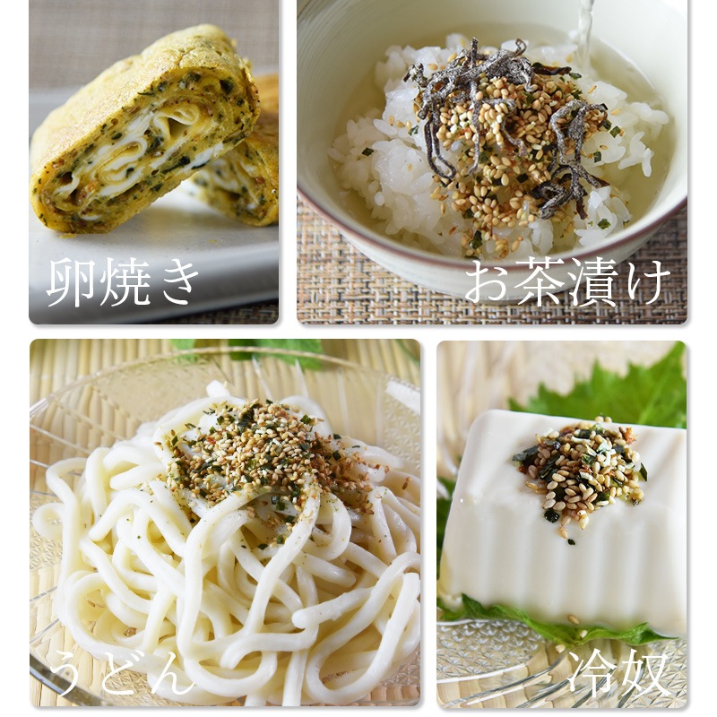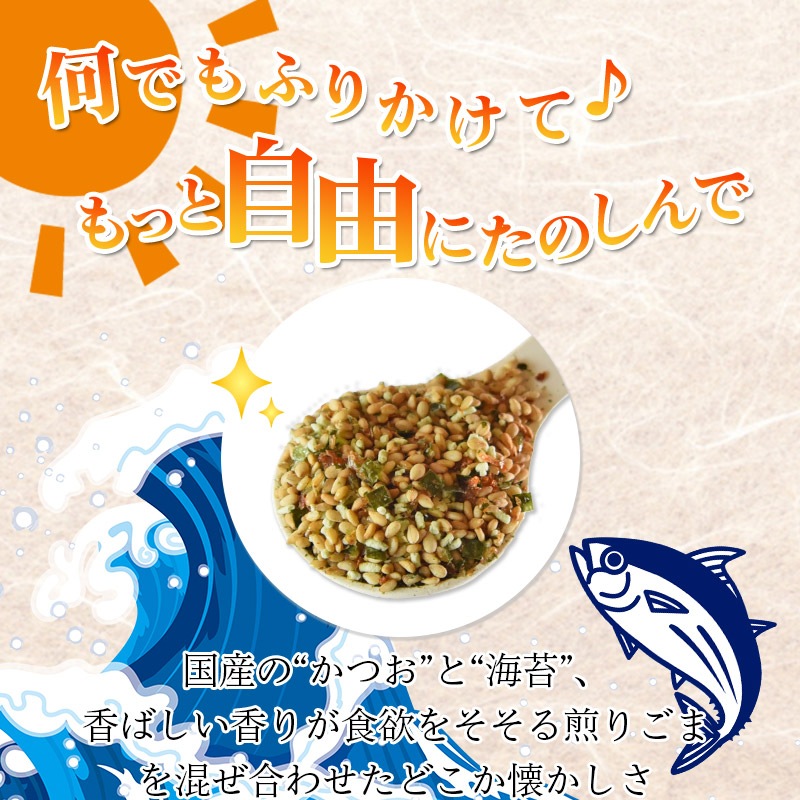| 原材料名 | 煎りごま(国内製造)、食塩、のり、砂糖、かつお削り節、醤油、乳糖、澱粉、いわし、たん白加水分解物、ブドウ糖、抹茶粉末、昆布粉末、ジンジャー粉末、オニオン粉末、澱粉分解物/調味料(アミノ酸等)、酸化防止剤(V.E)、ベニバナ黄色素、クチナシ色素、香辛料抽出物、(一部に乳成分・小麦・大豆・ごまを含む) |
