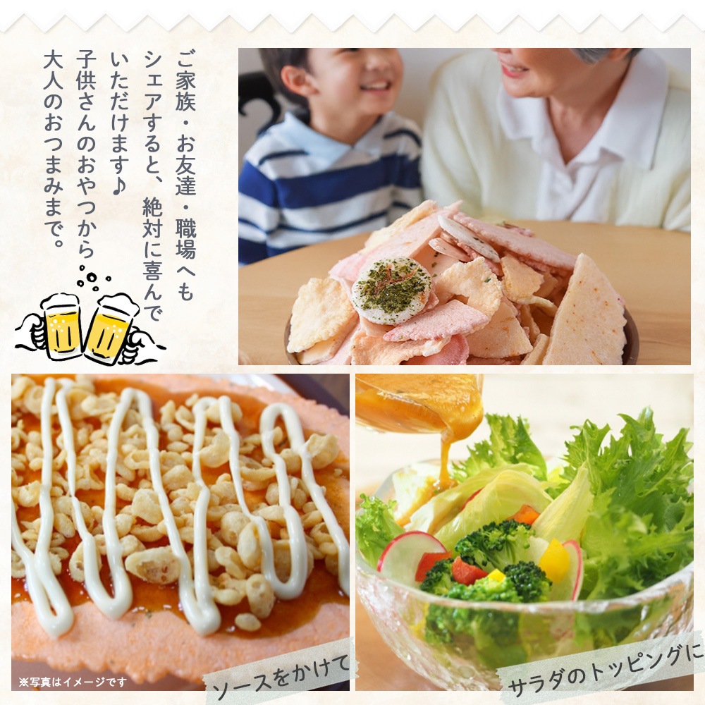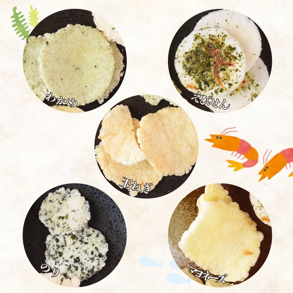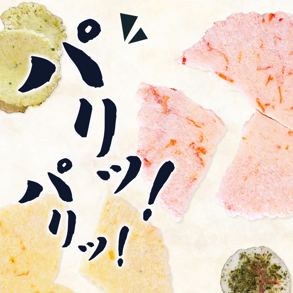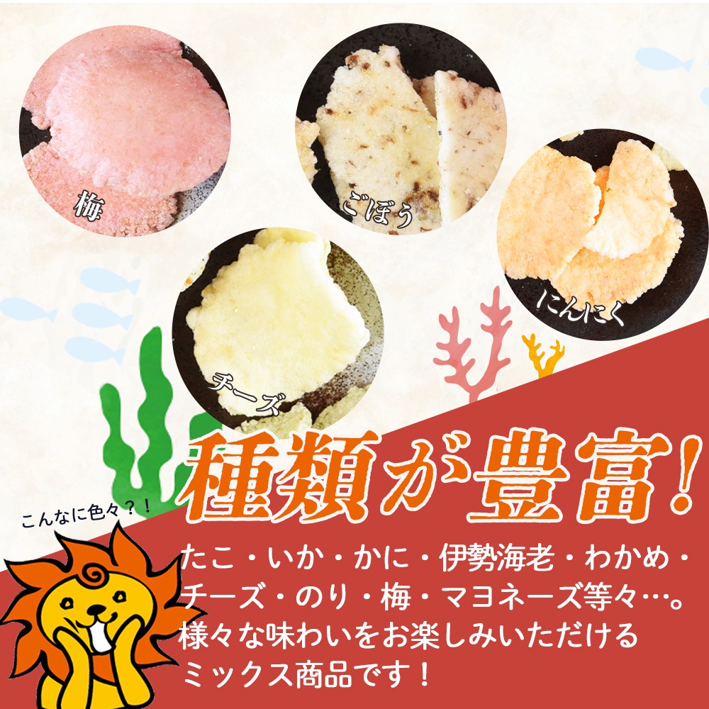 | 原材料名 | 澱粉(国内製造)、植物油、えび、食塩、たれ、シーズニング、砂糖、いか、さつまいも、米(国産)、アーモンド、たこ、ソース、ごぼう、あおさ、魚肉すり身、蚕白加水分解物、 わかめ、オキアミ、しらす、香辛料、生姜酢漬、かに、鮭ほぐし身、イカ粉、エキス、デキストリン、ごま、カレー粉、玉葱、葱、果糖ぶどう糖液糖、鮭トバ粉、桜葉塩漬 ほたて、イセエビ粉、削り節、焼海苔、キンメダイ、乳糖、人参、醤油、チーズ、果糖、魚醤(魚介類)、シナモン、還元水飴 /加工澱粉、調味料(アミノ酸等)、着色料(紅麹、カラメル、カロチノイド、ビートレッド、紅花黄、クチナシ、炭末、ウコン)、酸化防止剤(V.E)、ミョウバン、甘味料(ステビア、カンゾウ、スクラロース)、香料、乳化剤、酸味料、環状オリゴ糖、香辛料抽出物、安定剤(アカシア)、(一部にえび・かに・小麦・卵・乳成分・いか・ごま・さけ・さば・大豆・鶏肉・豚肉・ゼラチン・魚醤(魚介類)・アーモンドを含む) |