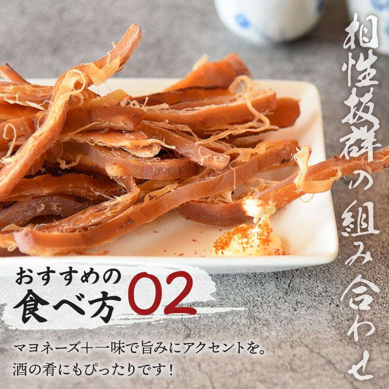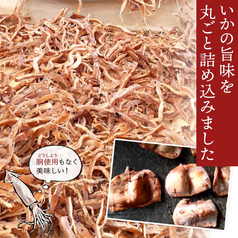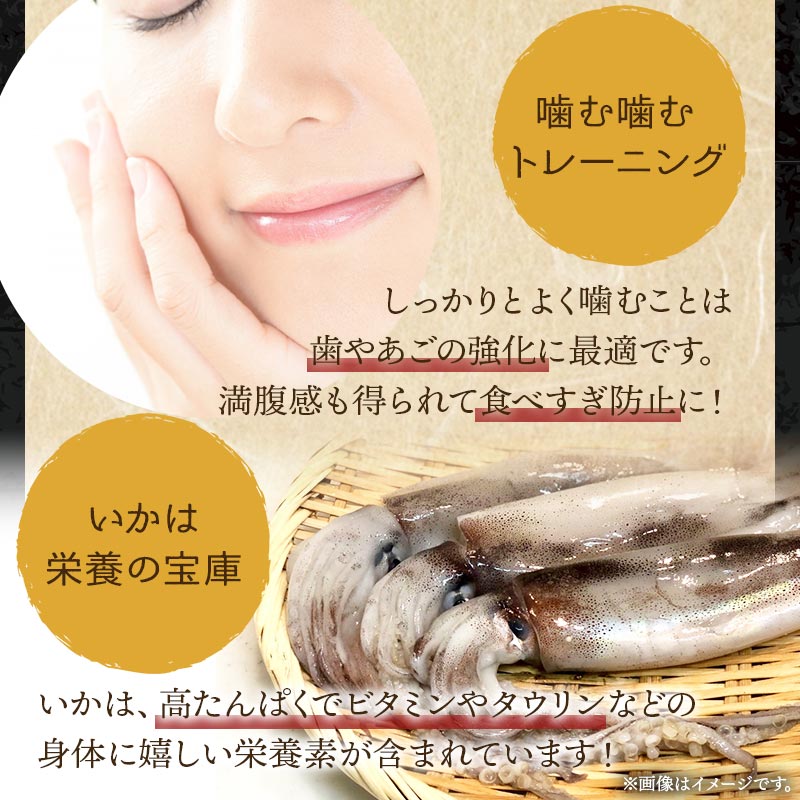 | 原材料名 | いか(中国)、砂糖、食塩、植物油、たん白加水分解物/ソルビット、調味料(アミノ酸等)、酒精、(一部にいか・大豆を含む) ※本品製造工場では特定原材料中、エビ・カニ・小麦・卵・乳成分を含む製品を生産しています |