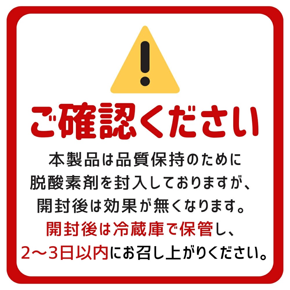 直射日光高温多湿の場所を避け保存。 本製品は品質保持のために脱酸素剤を封入しておりますが、 開封後は効果が無くなります。 開封後は冷蔵庫で保管し、 2~3日以内にお召し上がりください。 |